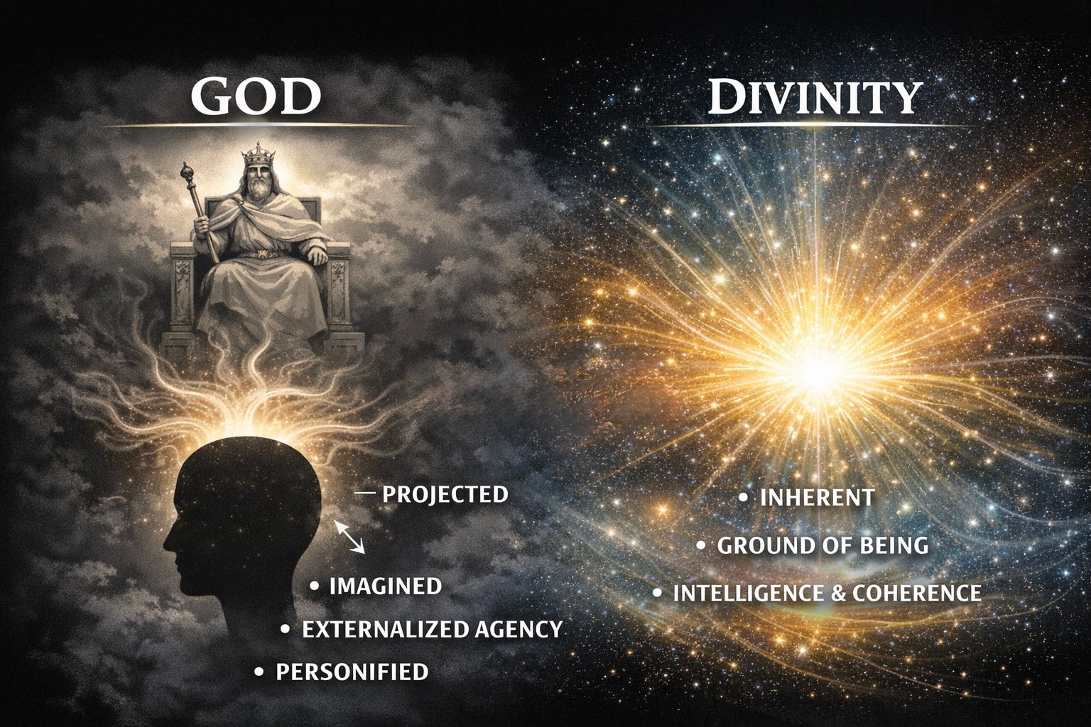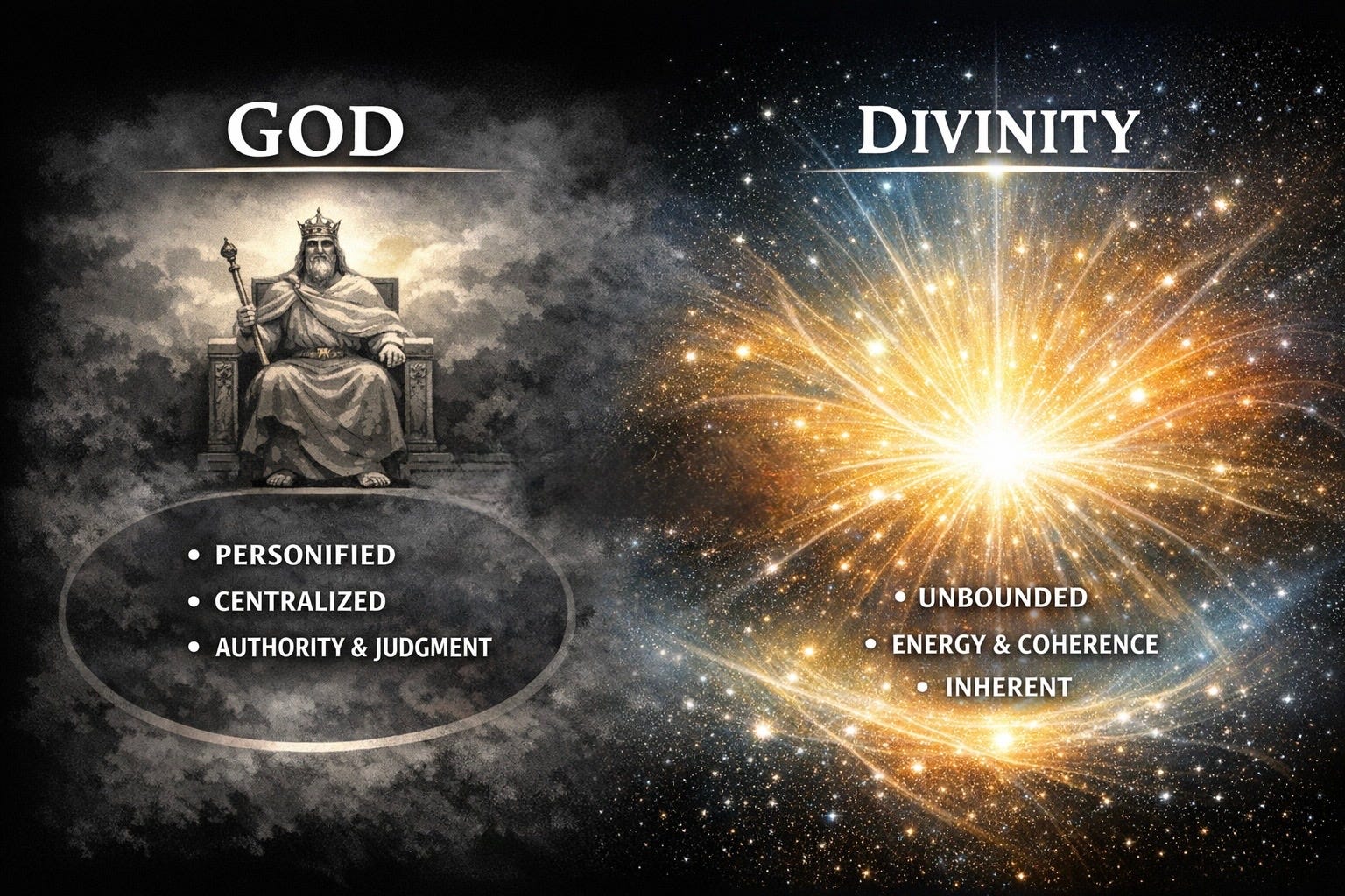 We have a linguistic problem that has quietly grown into a spiritual crisis. We use the words “God” and “divinity” as though they refer to the same reality, as though they are interchangeable terms pointing to a single truth. They are not. Treating them as synonymous has distorted how we understand agency, responsibility, and what it means to exist as a conscious being.